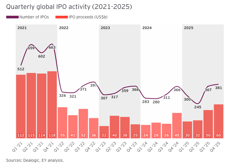 Investor selectivity rose sharply in 2025, according to EY's global IPO trends report, with profitability pathways, governance rigour, and clarity around AI monetisation becoming non-negotiable. Narrative-driven stories struggled. Cash-generative companies with defensible forecasts did better. That filter is only getting tighter in 2026.