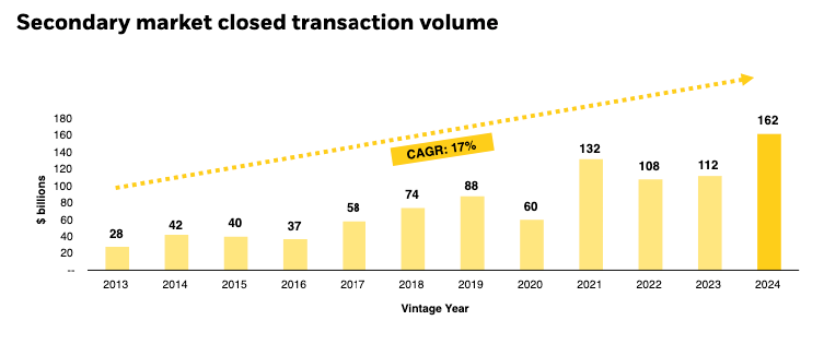 The private credit secondaries market has grown to answer this. Volume roughly doubled from $6 billion in 2023 to $11 billion in 2024, per Evercore. Projections point toward $18 billion+ in 2025.